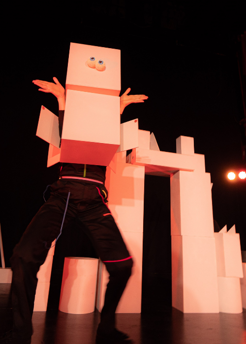 Um espetáculo sem palavras onde as formas, o corpo e a música contam a história no seu jogo constante de esconder, apanhar e baralhar. A música vem estabelecer o ritmo, a personalidade das formas, dialogar com estas e com os atores e desafiá-los para mais uma brincadeira.