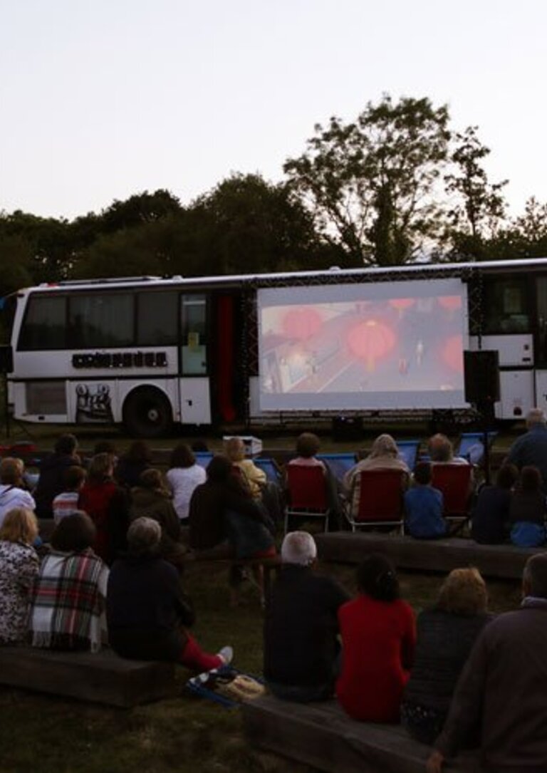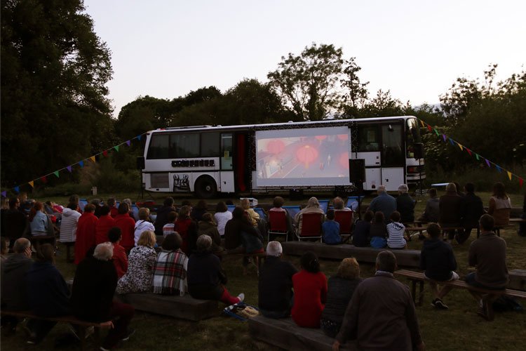 Os filmes de várias regiões do mundo são apresentados, ao ar livre, numa tela montada diretamente num autocarro.