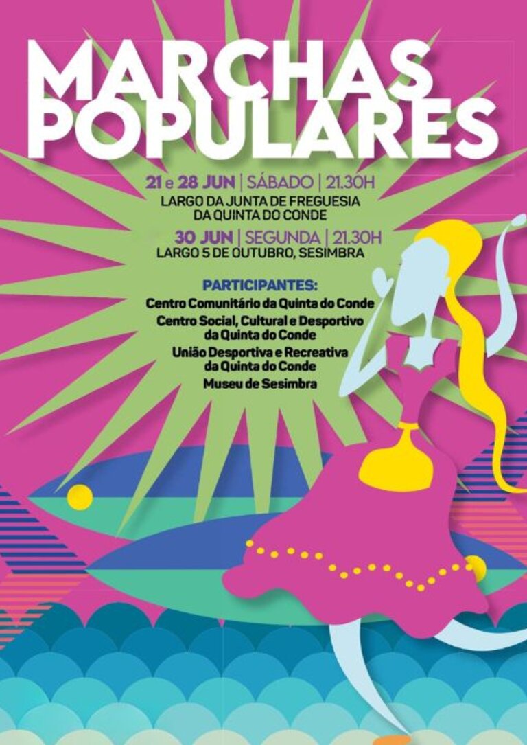 As Marchas Populares, um dos pontos altos das comemorações dos Santos Populares, saem à rua nos dias 21 e 28, sábados, no Largo da Junta de Freguesia da Quinta do Conde, e no dia 30, segundas, no Largo 5 de Outubro, na vila de Sesimbra, dinamizadas pelo Centro Comunitário da Quinta do Conde, Centro Social, Cultural e Desportivo da Quinta do Conde, União Desportiva Recreativa da Quinta do Conde e Museu de Sesimbra.