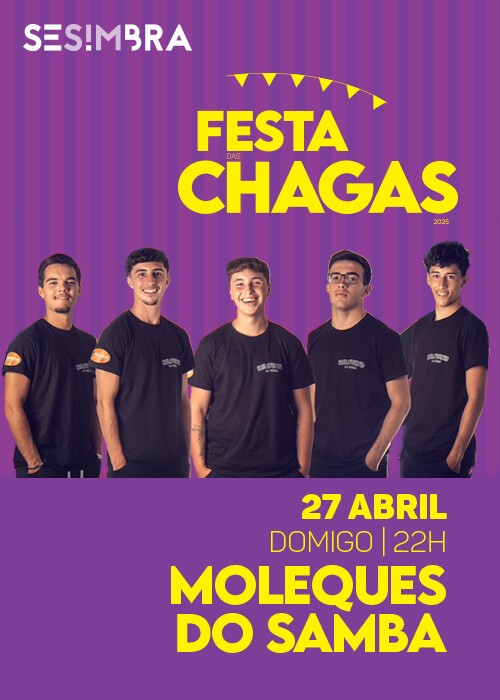 Cristiano Almeida, pandeiro, Bruno Sebastião, cavaquinho, António Zegre, rebolo, Simão Afonso, repique de mão, e João Folques, surdo, são os Moleques do Samba. Nascidos e criados em Sesimbra, estes cinco amigos decidiram criar o grupo de pagode para mostrar a sua paixão pela música brasileira. Deram os primeiros passos nas escolas de samba e grupos de axé de Sesimbra, e fizeram parte do programa musical de Carnaval, que animou as noites da vila. No palco da Feira da Festa das Chagas, este grupo de jovens sesimbrenses promete um espetáculo cheio de ritmo e samba no pé.