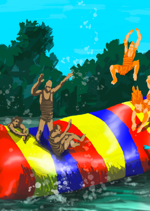 Imagine um mundo pós-apocalíptico, onde a terra foi submersa em água e a sobrevivência é a única prioridade. O último pedaço de terra que resta é uma pequena ilha flutuante, simbolizada pelo “Water Blob” — um insuflável amarelo de 12 metros, que representa o derradeiro refúgio da humanidade. É neste cenário de tensão e incerteza que as personagens lutam pelo que resta deste pequeno paraíso.