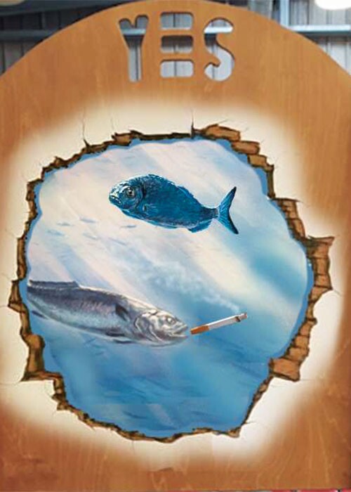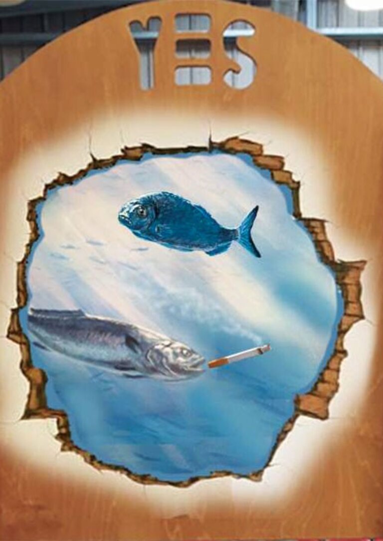 Os peixes aqui pintados com um ar curioso e investigador, com beatas ou cigarros na boca, têm uma conotação provocatória e transmitem, sem a utilização de palavras, o quão absurdo é vermos os animais a sofrer por consequência dos comportamentos humanos irrefletidos. Para comunicar, com tom de provocação, este problema de atirar as beatas para o mar e quais as consequência que este comportamento tem.