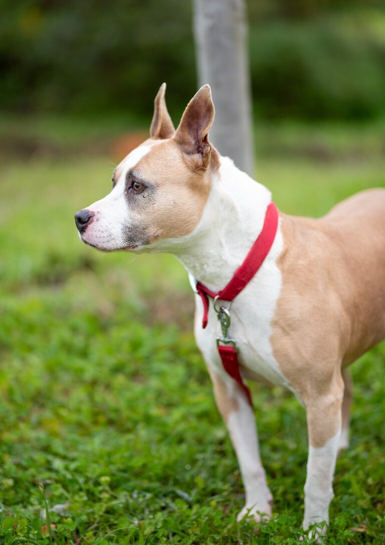 À primeira vista, parece mesmo uma Pitbull mais pequena do que o habitual, mas na verdade a Lady é uma American Staffordshire Terrier. Podíamos dizer apenas que é linda de morrer e tem um olhar que conquista toda a gente, mas para além disto ainda é muito meiga, cheia de energia, passeia bem à trela e adora roer (não podia ser perfeita em tudo, não é?).