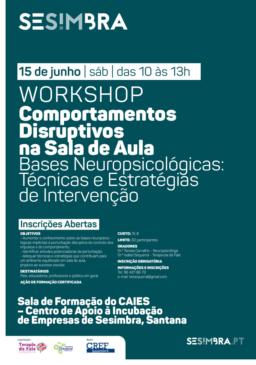 O workshop Comportamentos Disruptivos na Sala de Aula, Bases Neuropsicológicas: Técnicas e Estratégias de Intervenção, orientado por Teresa Carvalho, neuropsicóloga, e Isabel Sequerra, terapeuta da fala, realiza-se no dia 15 de junho, sábado, das 10 às 13 horas, no Centro de Apoio à Incubação de Empresas de Sesimbra.