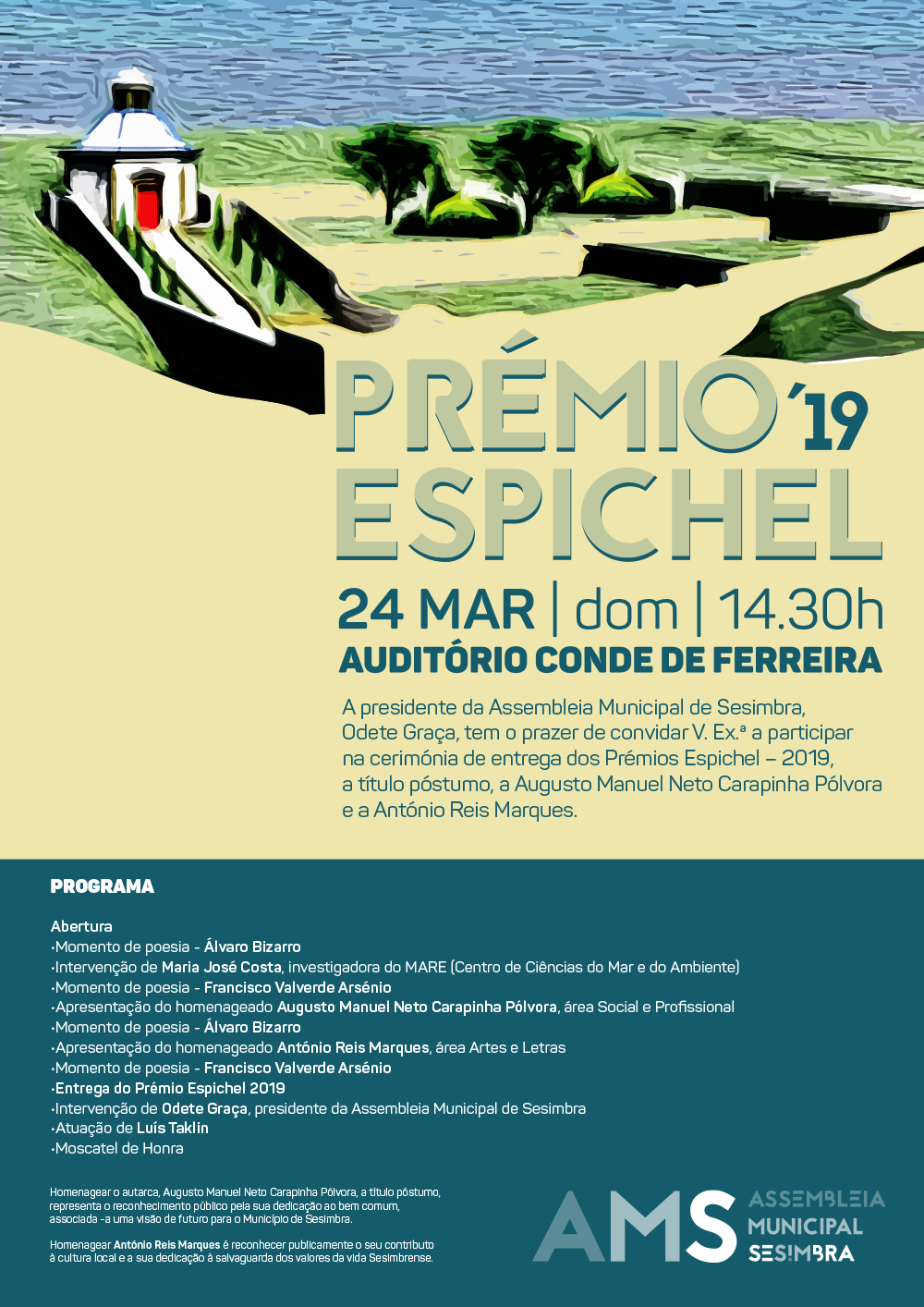 A Assembleia Municipal de Sesimbra vai atribuir o Prémio Espichel 2019 a Augusto Pólvora, a título póstumo, antigo presidente da Câmara Municipal de Sesimbra, falecido em julho de 2017, na área Social e Profissional, e a António Reis Marques, um dos maiores conhecedores da história de Sesimbra, na área Artes e Letras. A cerimónia de entrega está marcada para 24 de março, domingo, às 14.30 horas, no Auditório Conde de Ferreira.
