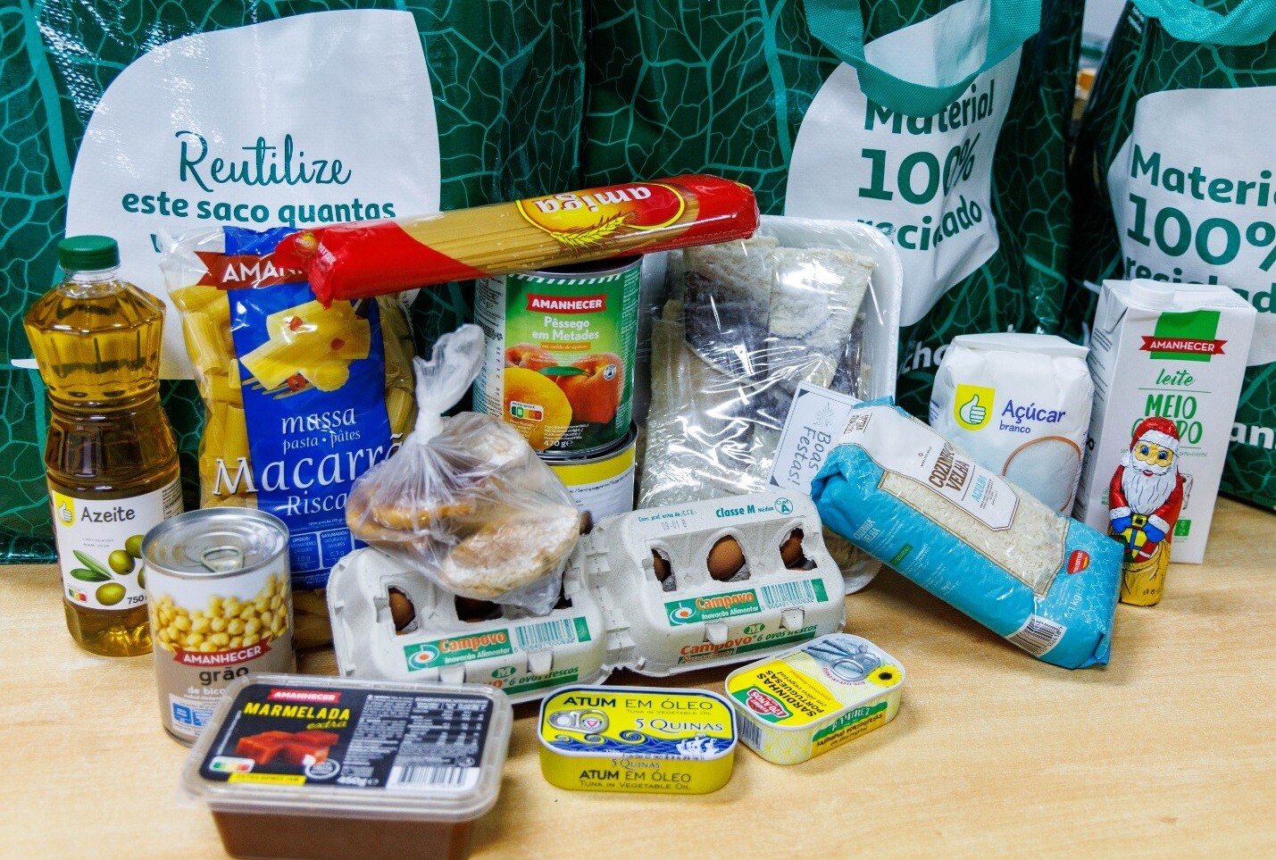 Além de bacalhau, o cabaz inclui azeite, broas, marmelada, leite, massas, arroz, açúcar, grão, ovos e atum, contribuindo assim para reforçar e melhorar significativamente a ceia natalícia destas famílias.