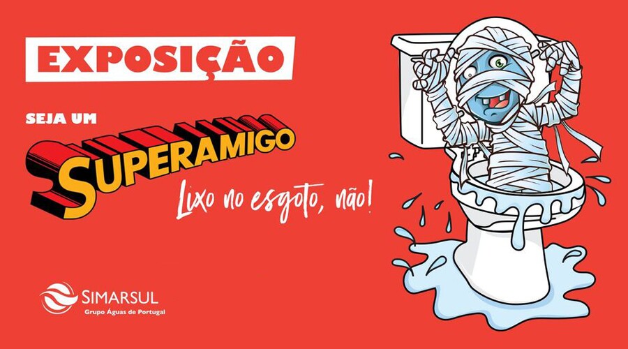 No átrio da Biblioteca Municipal de Sesimbra está patente, até 4 de dezembro, a exposição itinerante SUPERAMIGO. Lixo no esgoto, Não!
