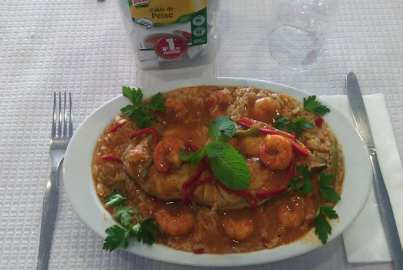 «O peixe e o marisco estão na base dos deliciosos pratos que trazem a Sesimbra muitos apreciadores de paladares simples e autênticos, daí o nosso snack-bar resolver apostar numa saborosa receita de Arroz de Garoupa com Camarões à moda da cozinheira e gerente do espaço D. Manuela. Começa-se por fazer um refogado com cebola, alhos, azeite, pimentos, tomate, vinho branco, caldos Knorr de peixe e marisco e ervas aromáticas. Reduz-se a caldo e volta-se a colocar ao lume. Quando ferver, adiciona-se o arroz e logo de seguida a garoupa e os camarões. Retifica-se os temperos, envolve-se e polvilha-se com coentros picados. Bom proveito!»![]()