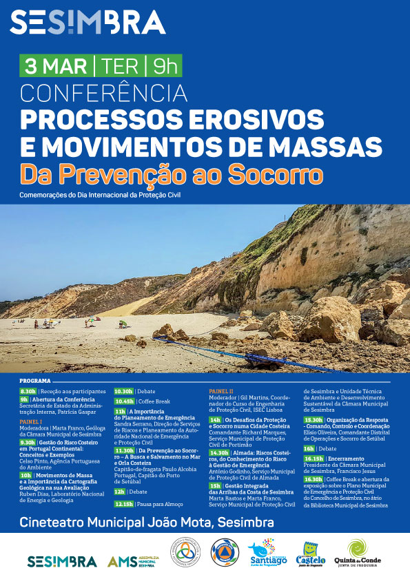 O Dia Internacional da Proteção Civil é assinalado no concelho com a conferência Processos Erosivos e Movimentos de Massas - Da Prevenção ao Socorro, que decorre no dia 3 de março, terça-feira, a partir das 9 horas, no Cineteatro Municipal João Mota, em Sesimbra. A iniciativa conta com a participação da secretária de Estado da Administração Interna, Patrícia Gaspar, e do presidente da Câmara Municipal de Sesimbra, Fransciso Jesus.