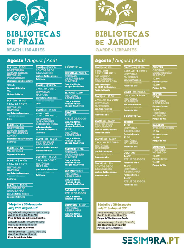 As Bibliotecas de Praia são sempre uma excelente oportunidade para pôr a leitura em dia, com dezenas de livros infantis, juvenis e adultos, em língua nacional e estrangeira, nomeadamente em inglês, francês, alemão e espanhol, e abrangem áreas como a banda desenhada, ficção científica ou romance. Além disso, disponibilizam diariamente jornais e revistas nacionais. A par da leitura, têm uma programação direcionada para o