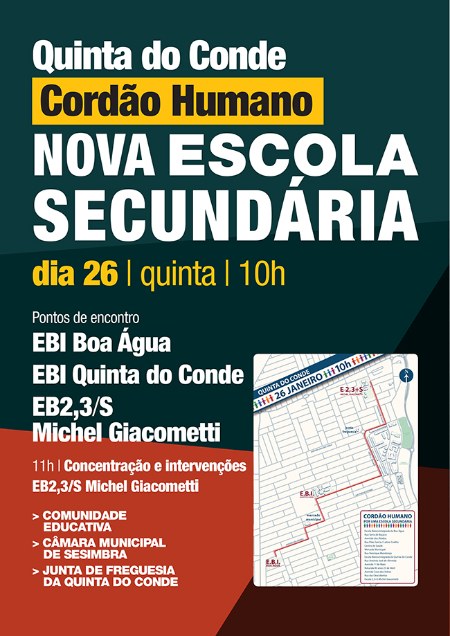As associações de pais das escolas da Quinta do Conde, a Câmara Municipal de Sesimbra e a Junta de Freguesia da Quinta do Conde promovem, no dia 26 de janeiro, quinta-feira, às 10 horas, um cordão humano que ligará as sedes dos três agrupamentos de escolas da freguesia, como forma de reivindicar a construção de uma Escola Secundária na freguesia. O cordão vai começar a formar-se na Escola Básica Integrada da Boa Água, passa pela Escola Básica Integrada da Quinta do Conde e termina na Escola Básica 2,3+S Michel Giacometti, onde às 11.30 horas, terá lugar uma concentração com intervenções de autarcas e representantes da comunidade educativa.