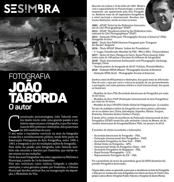 Conceituado pneumologista, João Taborda revelou desde muito cedo uma grande paixão e um talento especial para a fotografia, o que lhe valeu mais de 800 prémios e distinções, dos quais mais de 300 medalhas de ouro.