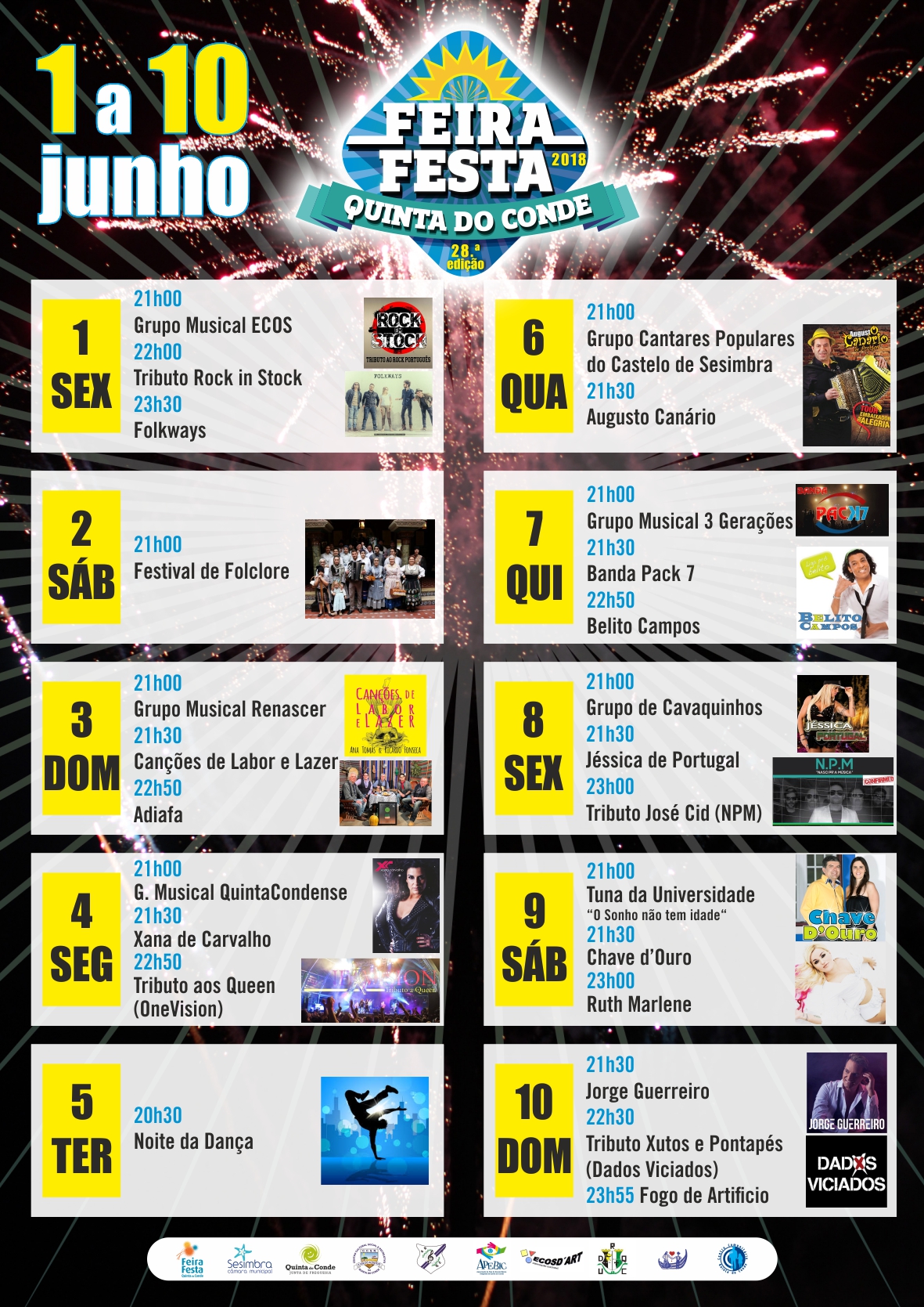 Adiafa, Ruth Marlene, Jéssica Portugal, Belito Campos, Augusto Canário e Jorge Guerreiro são os cabeças de cartaz do programa da 28.ª edição da Feira Festa da Quinta do Conde, uma das principais mostras de atividades económicas da região, que decorre de 1 a 10 de junho.