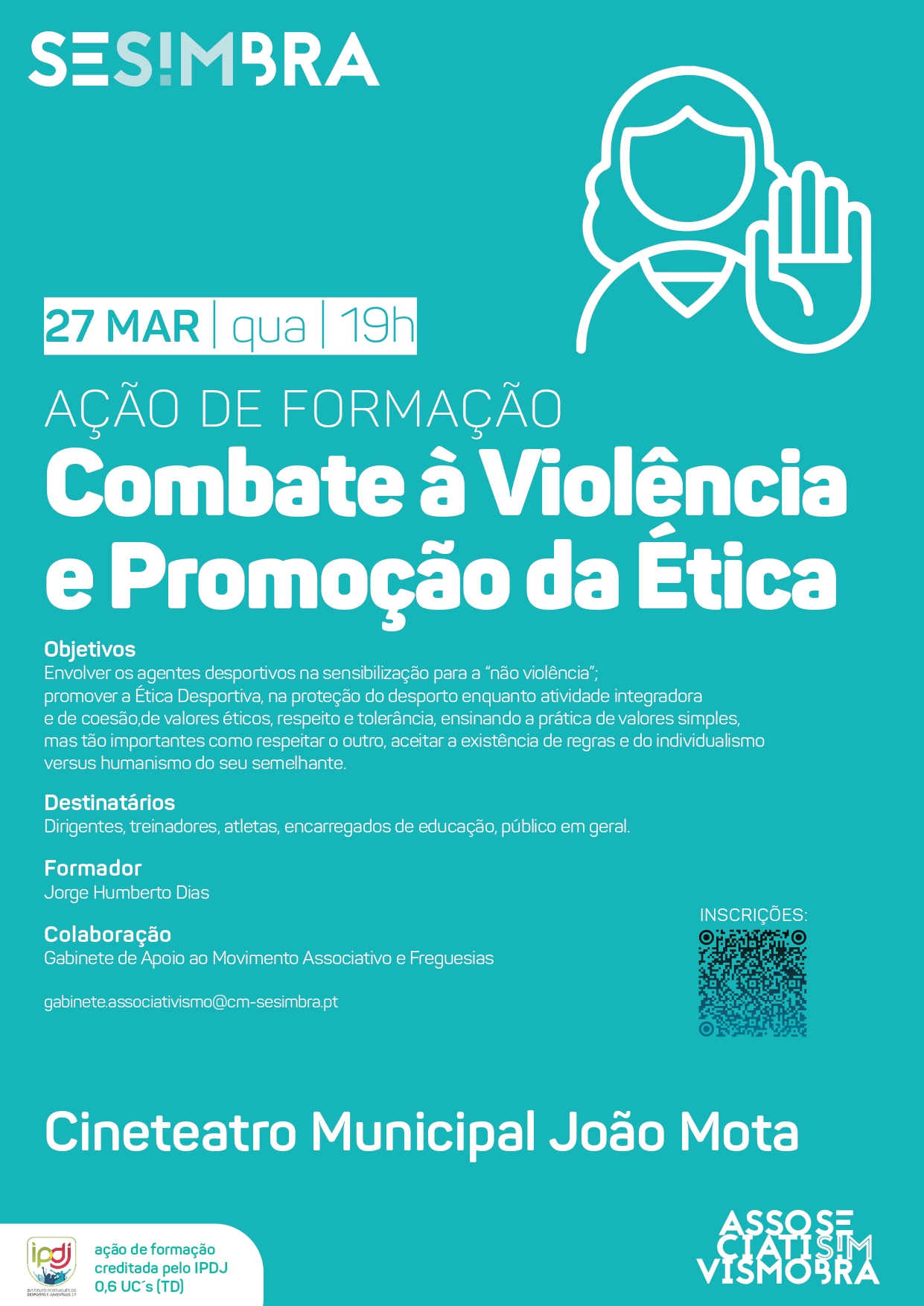 A Câmara Municipal de Sesimbra promove, através do Gabinete de Apoio ao Movimento Associativo e Freguesias, a ação de formação presencial, Combate à Violência e Promoção da Ética no Desporto, que se realiza no dia 27 de março, às 19 horas, no Cineteatro Municipal João Mota, na vila de Sesimbra.