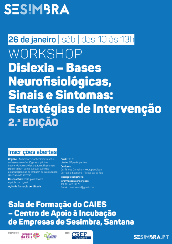 Estão abertas inscrições para a segunda edição do workshop Dislexia – Bases Neurofisiológicas, Sinais e Sintomas: Estratégias de Intervenção, que decorre no dia 26 de janeiro, sábado, das 10 às 13 horas, na Sala de Formação do Centro de Apoio à Incubação de Empresas de Sesimbra (CAIES), em Santana.