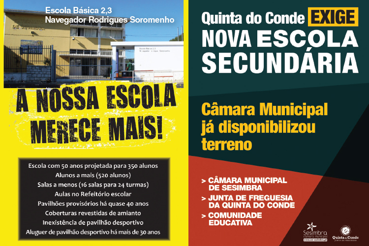 No caso da Quinta do Conde, a única escola secundária da freguesia, a Michel Giacometti, encontra-se sobrelotada e com sinais cada vez mais evidentes de degradação. Isso mesmo foi constatado pelo delegado Regional de Educação de Lisboa e Vale do Tejo, Francisco Neves, em visita recente ao concelho. Esta situação obriga a que muitos alunos tenham de se deslocar para os concelhos vizinhos para estudar, o que não faz qualquer sentido numa das freguesias com maior crescimento demográfico e com mais de 30 por cento da população com idade inferior a 30 anos.