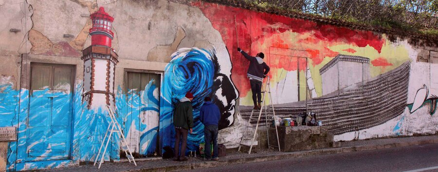 Os quatro artistas urbanos têm vários trabalhos expostos na vila de Sesimbra no âmbito do projeto Sesimbra é Peixe e Arte na Rua.