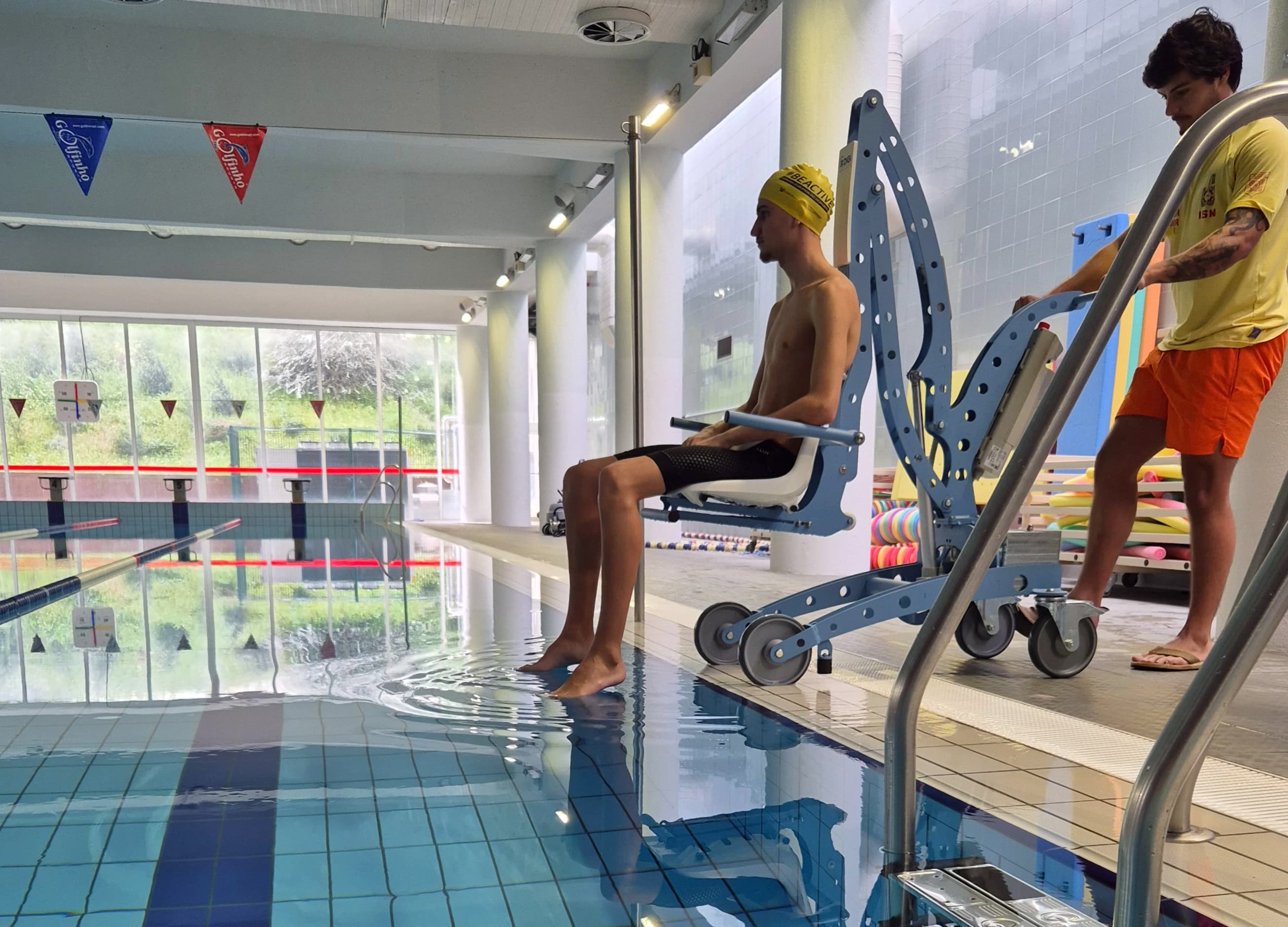 A cadeira ajuda os utentes da piscina, principalmente os mais idosos que frequentam as aulas de hidroginástica e que apresentam dificuldades em descer e subir as escadas de acesso à água.