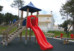 Equipamentos: Estrutura multifunções composta por torre com telhado, escorrega, acesso em rampa e piso inferior com baloiço. Espaço vedado.