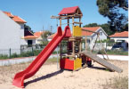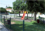 Equipamentos: Baloiço, estrutura multifunções com escorrega, escada de acesso, torre com telhado, rede de marinheiro e três molas. Espaço vedado, com portões de acesso.