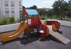 Equipamentos: estrutura multi-funções com uma torre e telhado, escorrega e acesso por espaldar, uma tendinha no rés-do-chão, uma estrutura com baloiço, um tubo de trepar, um baloiço axial para dois utilizadores com molas helicoidais.