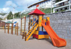 Equipamentos: Torre com duas plataformas, uma das quais coberta com telhado, escorrega e escada de acesso. Estrutura com rede de marinheiro, cinco espaldares, barras horizontais, duas molas e rede tridimensional. Espaço vedado.