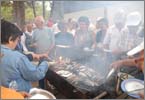A tradicional sardinha assada, um dos pratos típicos da gastronomia local, é presença obrigatória no almoço, que conta também com animação musical.
