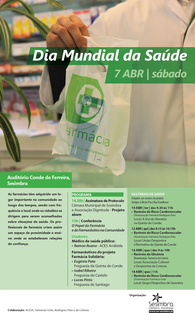 A Câmara Municipal de Sesimbra assinala o Dia Mundial da Saúde, 7 de abril, com a conferência O Papel da Farmácia e do Farmacêutico na Comunidade, que se realiza às 15 horas, no Auditório Conde de Ferreira, em Sesimbra.