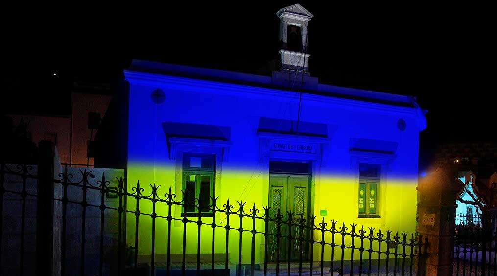 No concelho de Sesimbra estão em curso várias ações de solidariedade para com o povo ucraniano e com as vítimas da guerra. Também, num simbólico apelo à Paz, o Auditório Conde de Ferreira vai estar a partir desta noite iluminado de amarelo e azul, as cores da bandeira da Ucrânia.