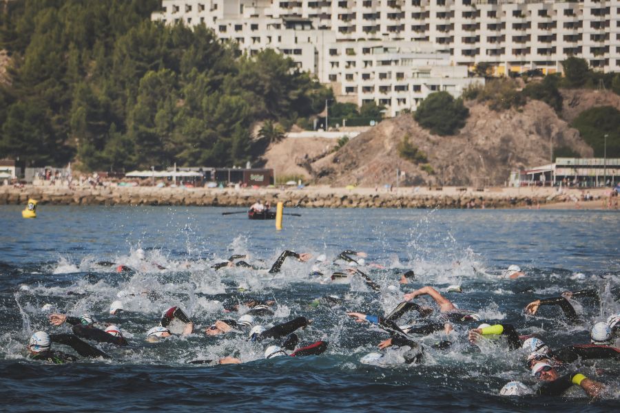 Antes do arranque, cada nadador teve de colocar na perna uma pulseira com um chip e de entregar o seu cartão de identificação para ter acesso às boxes criadas na zona de entrada na água.