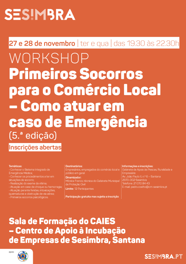 Estão abertas inscrições para o workshop Primeiros Socorros para o Comércio Local – Como Atuar em caso de Emergência, que decorre nos dias 27 e 28 de novembro, terça e quarta, das 19.30 às 22.30 horas, na Sala de Formação do CAIES – Centro de Apoio à Incubação de Empresas de Sesimbra, Santana.