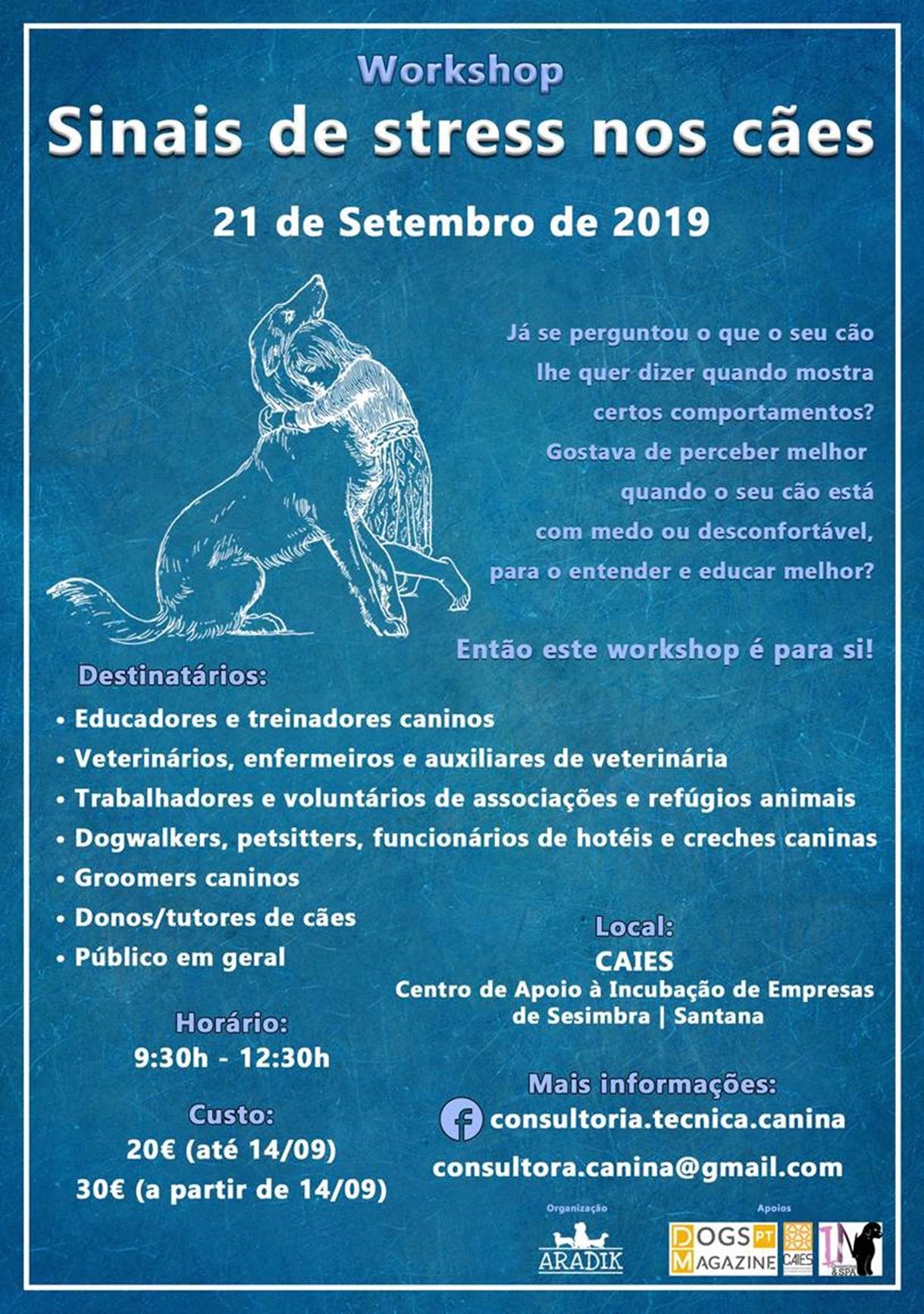 O Centro de Apoio à Incubação de Empresas de Sesimbra, em Santana, recebe, no dia 21 de setembro, sábado, das 9.30 às 12.30 horas, o workshop Sinais de stress nos cães, que pretende ajudar a analisar e entender alguns comportamentos dos animais.